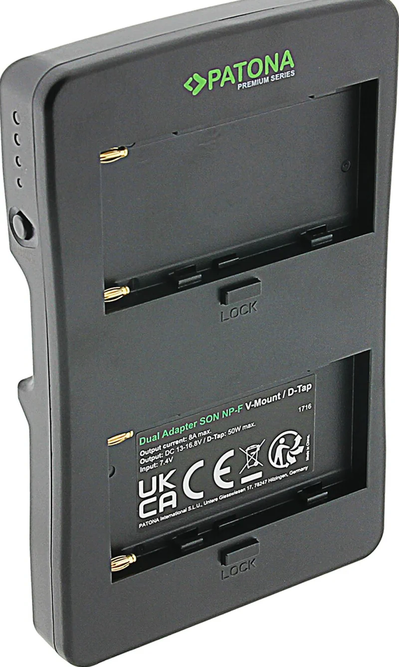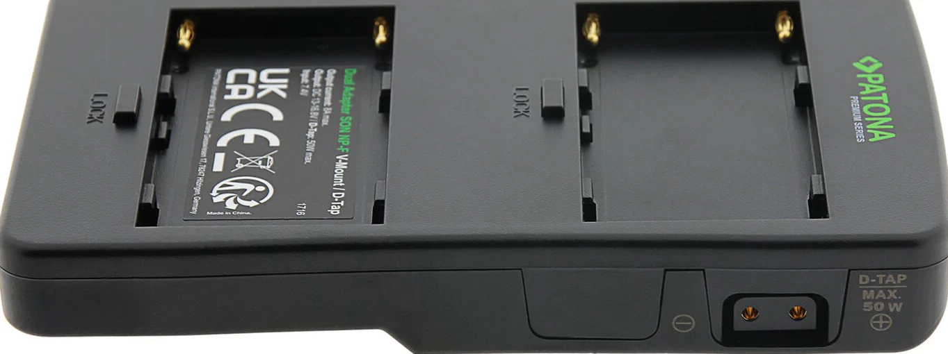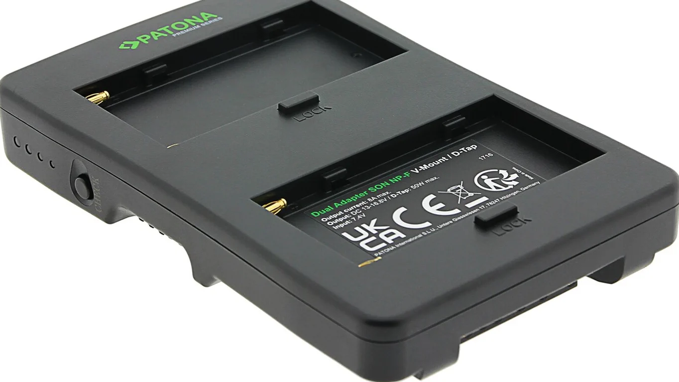La novità della nostra PATONA V-Mount-Serie è l’adattatore V-Mount. Questo adattatore consente di utilizzare contemporaneamente 2 batterie Sony della serie NP-F su un connettore V-Mount.