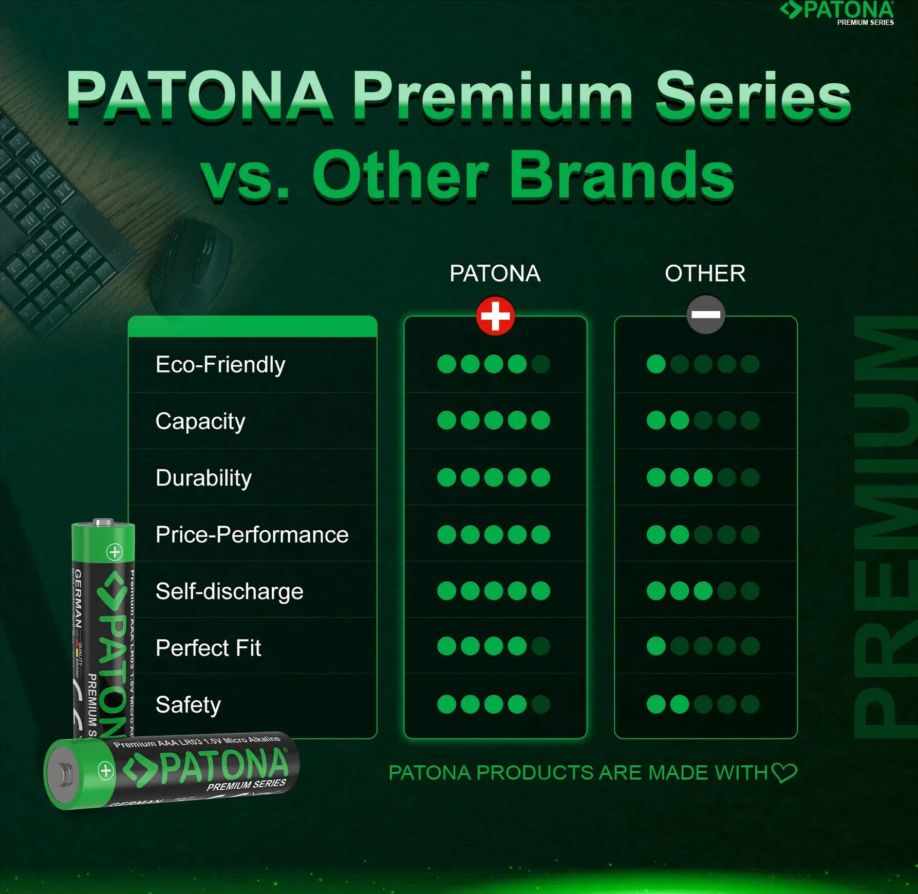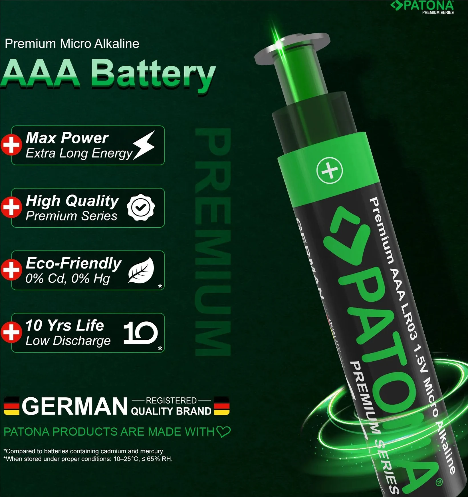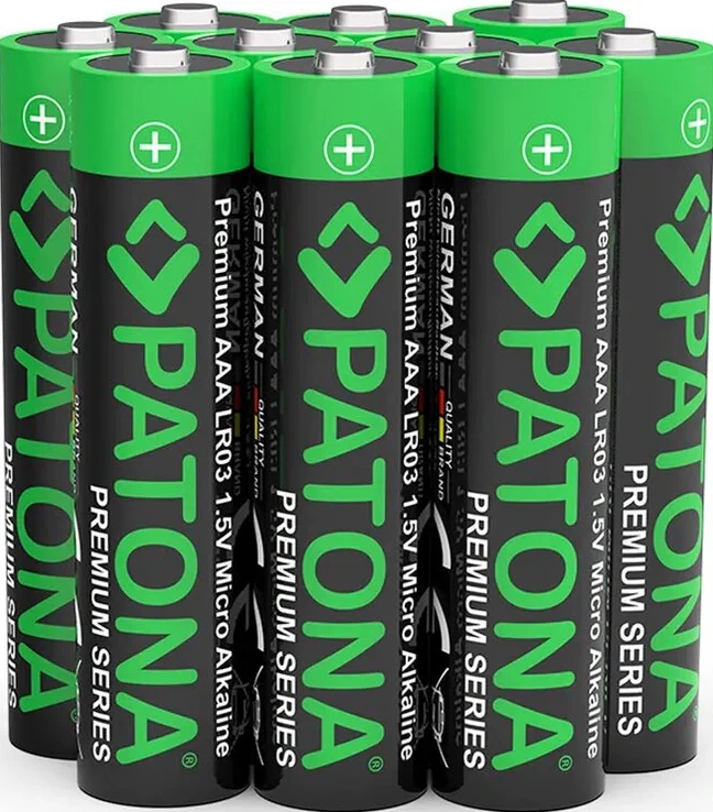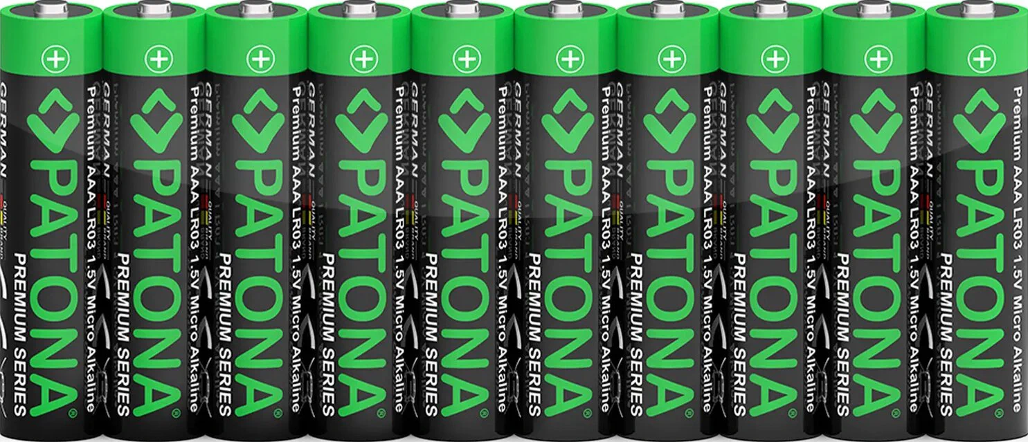 Le batterie alcaline AAA Micro LR03 Premium PATONA sono batterie usa e getta compatte e potenti, spesso utilizzate in vari dispositivi elettronici. Forniscono una fonte di alimentazione affidabile per applicazioni con requisiti energetici medio-alti e sono note per la loro lunga durata di conservazione e il basso livello di autoscarica. Le applicazioni tipiche includono telecomandi, torce elettriche, orologi, giocattoli e gadget, fotocamere digitali e flash, mouse, tastiere, rilevatori di fumo, dispositivi di sicurezza, vari elettrodomestici e molto altro ancora.