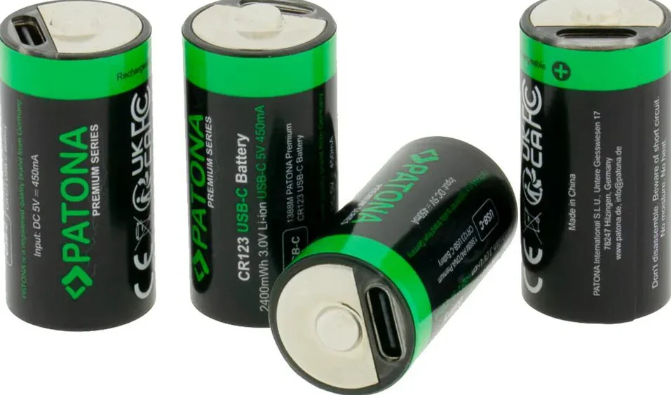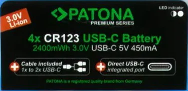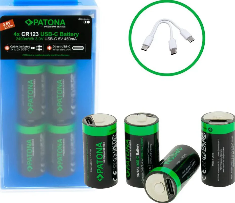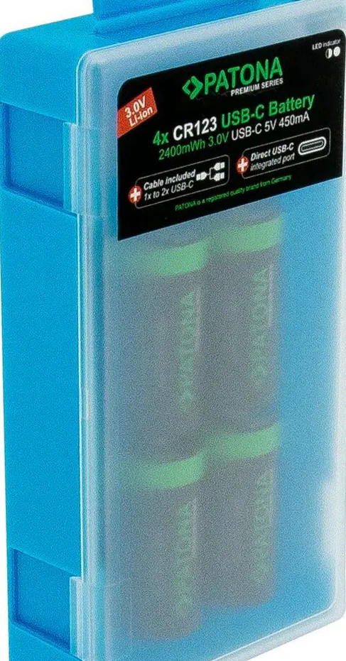 – 4 batterie agli ioni di litio PATONA CR123A con USB-C