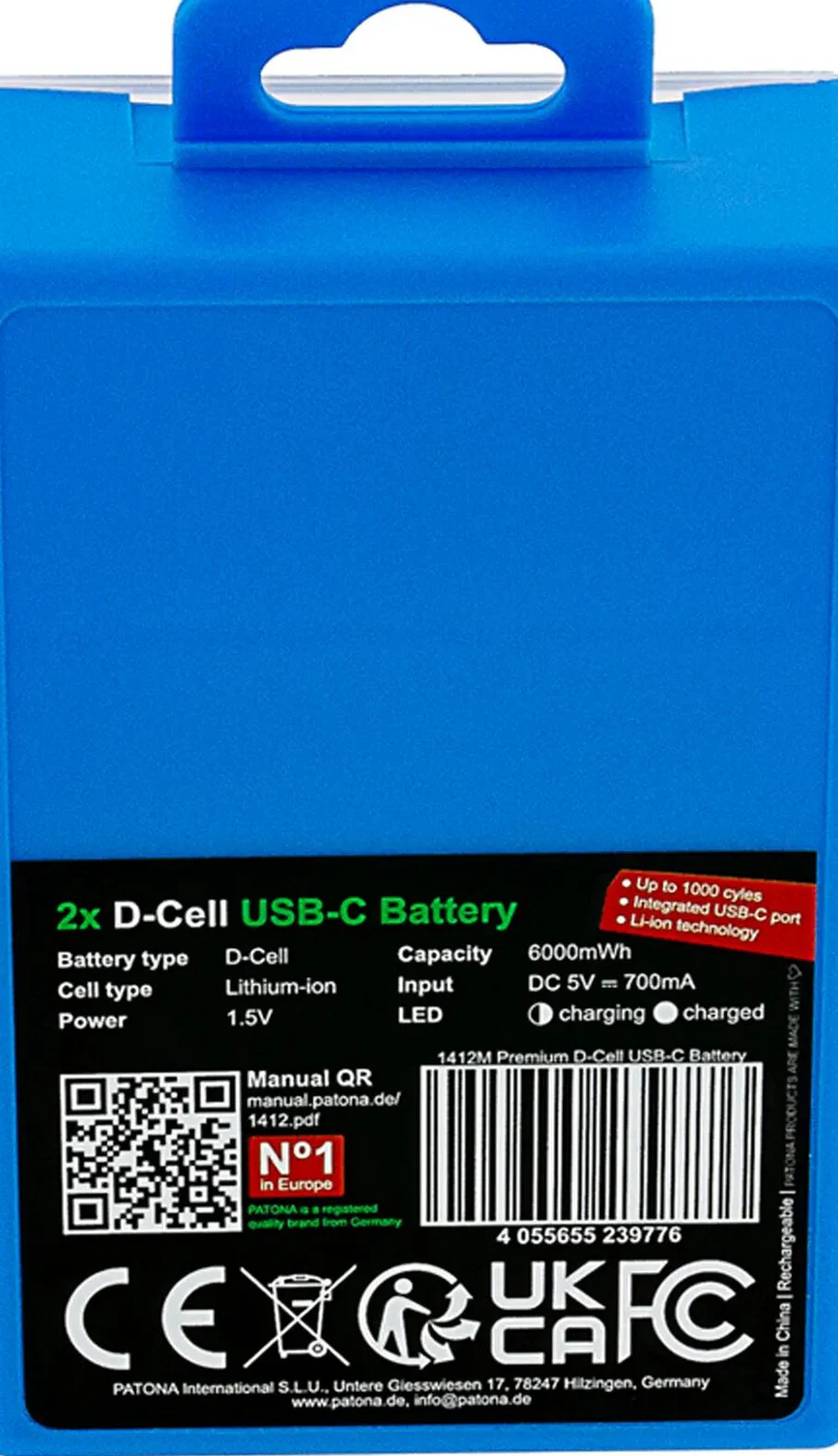 Grazie all’ingresso USB-C, le batterie PATONA Premium LR20 (D) USB-C possono essere ricaricate rapidamente e facilmente utilizzando il cavo USB-C 1-to-2 incluso e vari dispositivi di ricarica come power bank, caricatori per auto, PC o adattatori GaN.