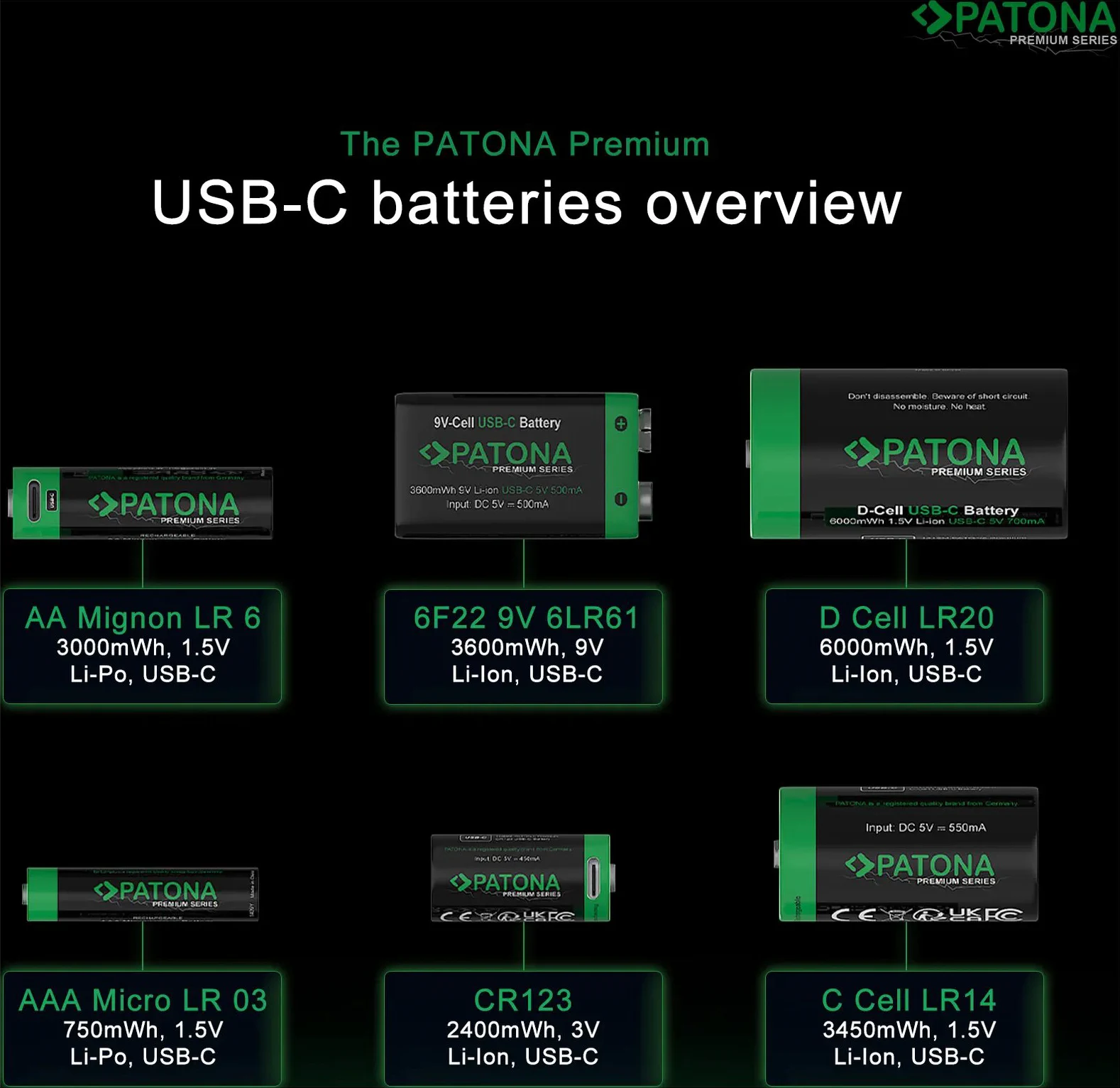 Con le nostre nuove batterie PATONA Premium LR14 Baby C USB-C investite in tecnologia sostenibile e di alta qualità. Queste batterie di fascia alta convincono per la loro notevole capacità e la tensione stabile di 1,5 volt, che le rende una fonte di energia indispensabile per una vasta gamma di dispositivi. Che si tratti di radio, torce elettriche, giocattoli o orologi da parete, le prestazioni superiori di queste batterie vi conquisteranno.