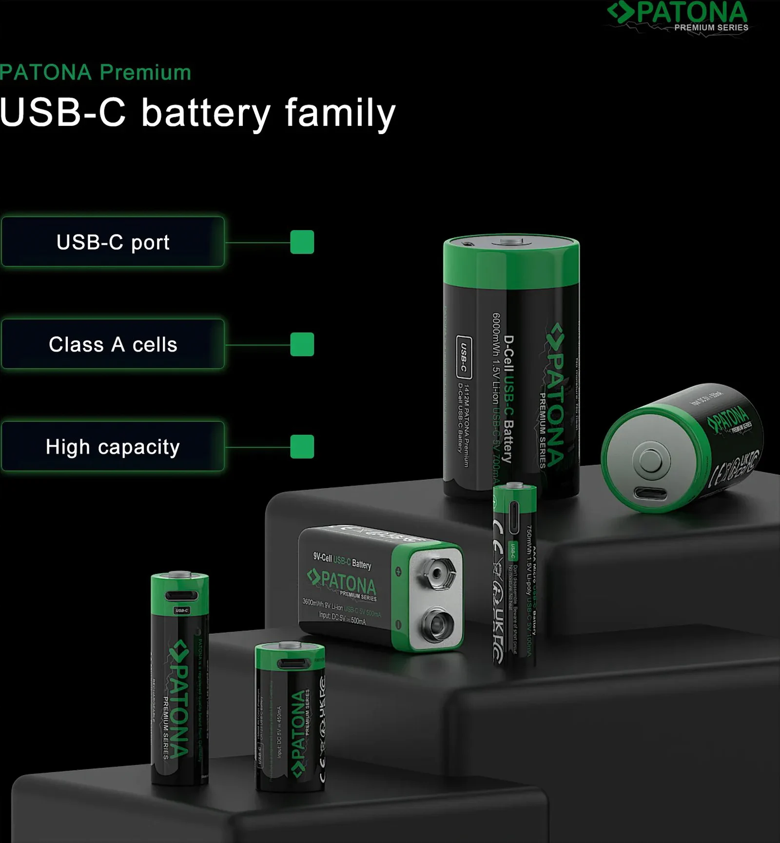 Grazie all’ingresso USB-C, le batterie PATONA Premium Baby (C) USB-C possono essere ricaricate in modo rapido e comodo con il cavo USB-C 1-to-2 incluso e vari dispositivi di ricarica come power bank, caricatori per auto, PC o adattatori GaN.