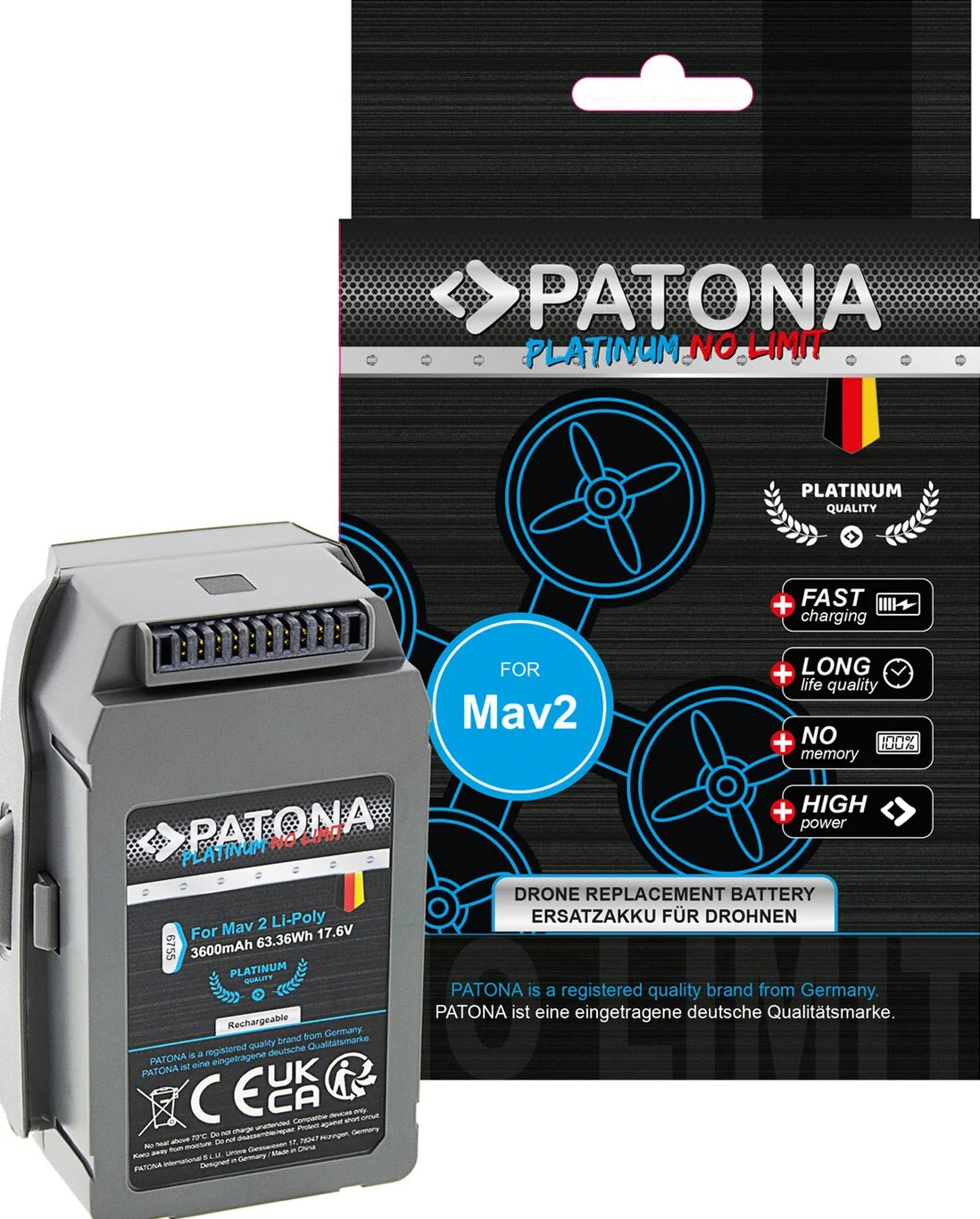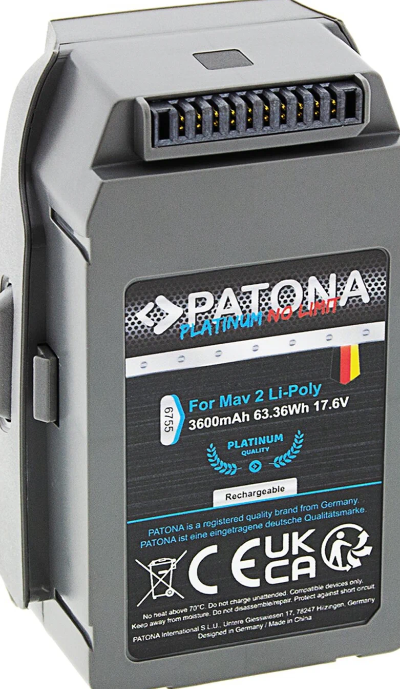 La serie PATONA Platinum è stata sviluppata per un piacere di volo sensazionalmente duraturo. Le prestazioni delle celle installate sono praticamente inesauribili. Nella serie PATONA Platinum sono state installate le celle più avanzate, caratterizzate da una qualità eccezionale e impressionante allo stesso tempo. La serie Platinum rappresenta la massima qualità, la maggiore durata e l’innovazione più avanzata di PATONA. Acquistando una batteria della serie PATONA Platinum, ottieni un prodotto eccellente e raffinato che ti affascinerà. 100% compatibile con le batterie originali DJI grazie alla forma su misura, che include protezione contro sovraccarichi e cortocircuiti.