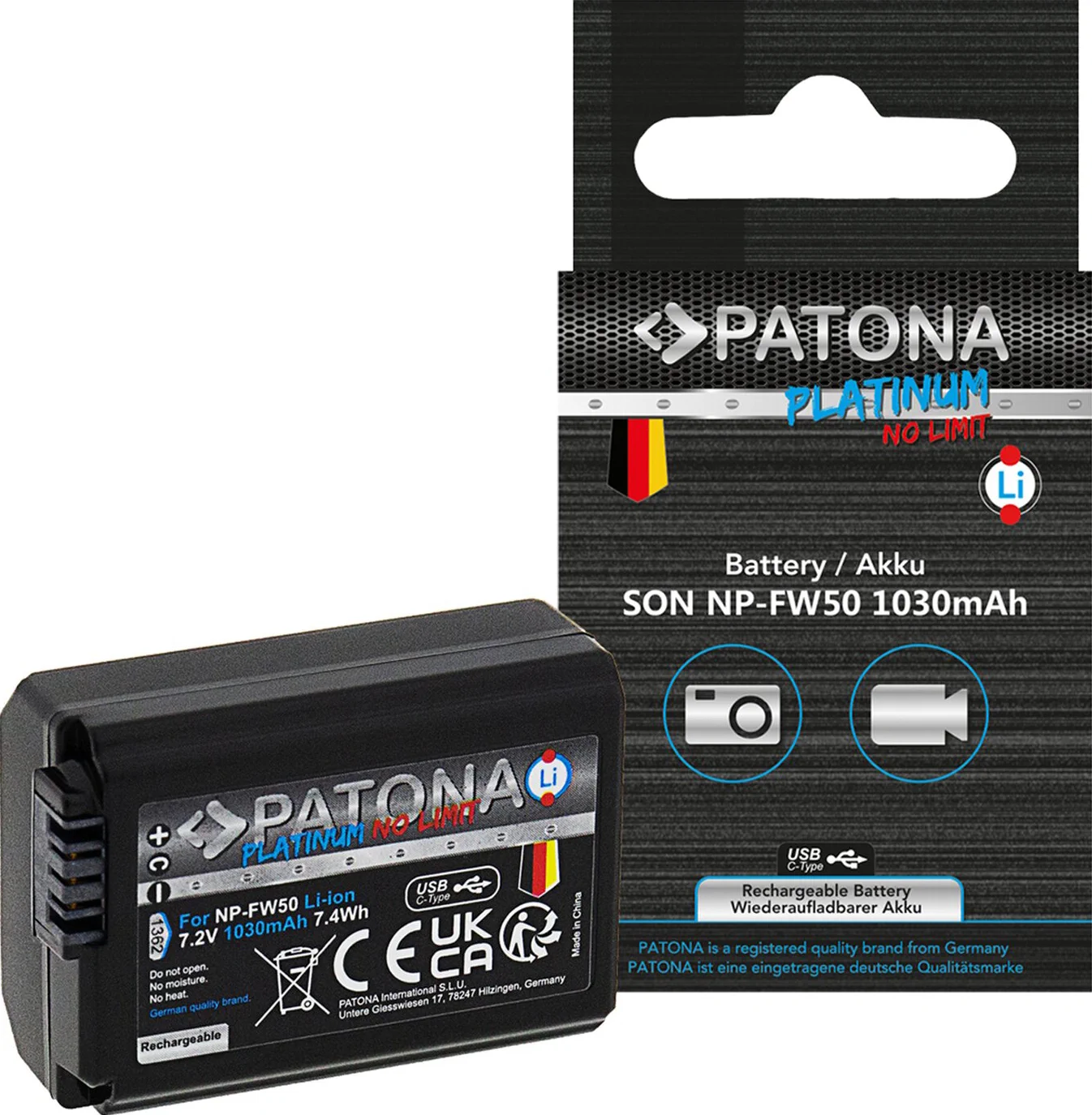 Dati Tecnici: Capacità elevata: 1030mAh / 7,2V / 7,4Wh Ingresso USB-C: max. 1,2A (Correnti di ingresso più elevate vengono automaticamente ridotte tramite controllo IC della batteria). Tipo: Li-ion Marca: PATONA Platinum