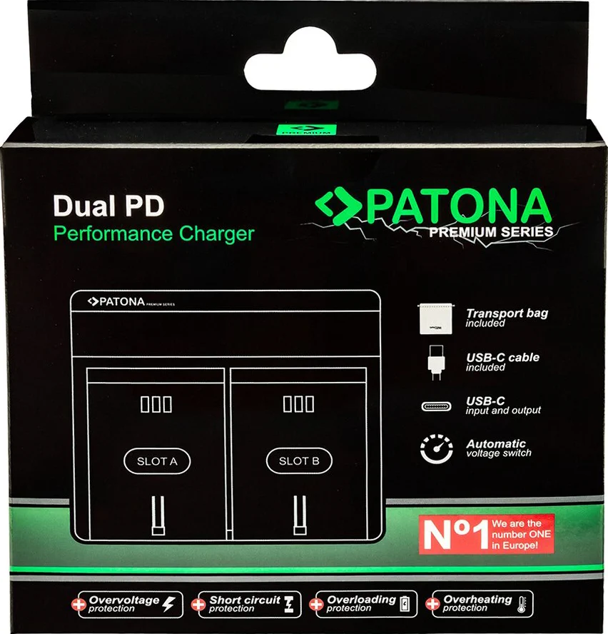 Il caricabatterie PATONA Premium Dual PD consente la ricarica rapida e simultanea di due batterie, indipendentemente dalla loro capacità. La tecnologia di ricarica intelligente riconosce automaticamente la tensione delle batterie inserite e previene efficacemente il sovraccarico o il surriscaldamento.