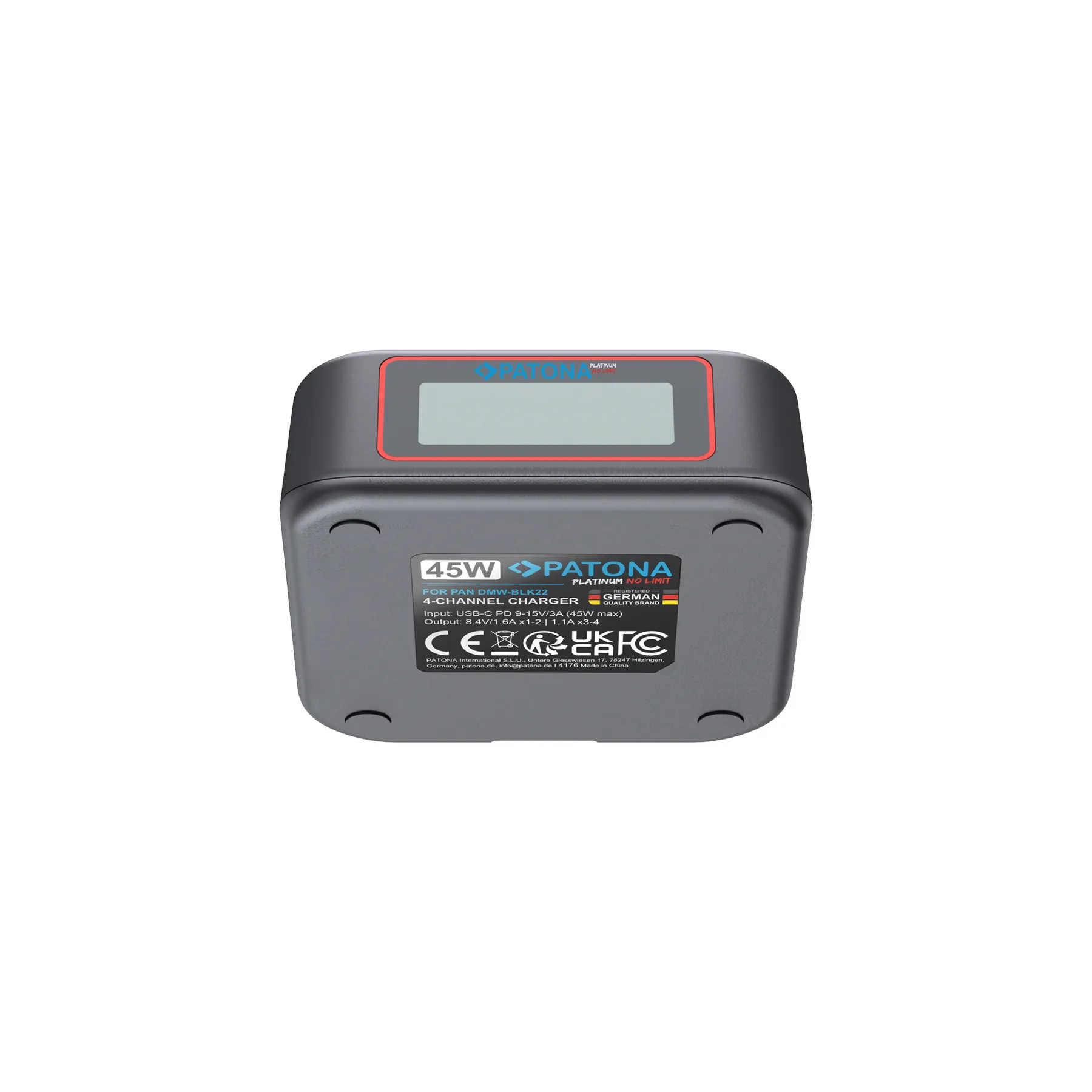 Con il caricabatterie a 4 canali PATONA Platinum, avrai la soluzione di ricarica perfetta per le batterie Panasonic DMW-BLK22. Ti consente di ricaricare fino a quattro batterie contemporaneamente e supporta i moderni protocolli di ricarica rapida USB-C (PD e QC). Grazie a una potenza massima in ingresso di 45 W, il caricabatterie regola in modo intelligente l’uscita per garantire una ricarica particolarmente veloce e sicura, sia che si ricarichi una sola batteria o tutte e quattro contemporaneamente.