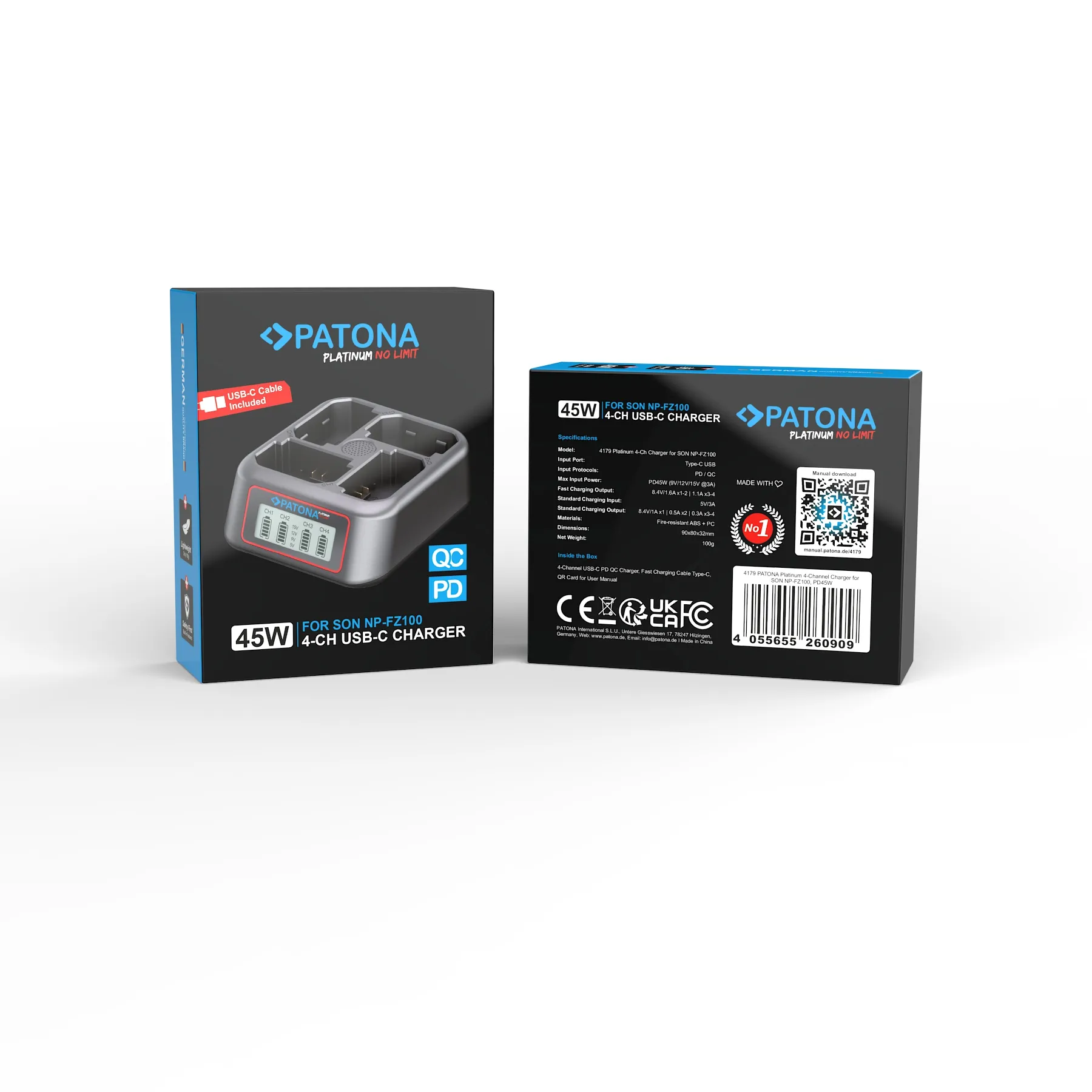Con il caricabatterie a 4 canali PATONA Platinum, avrai la soluzione di ricarica perfetta per le batterie Sony NP-FZ100. Ti consente di ricaricare fino a quattro batterie contemporaneamente e supporta i moderni protocolli di ricarica rapida USB-C (PD e QC). Grazie a una potenza massima in ingresso di 45 W, il caricabatterie regola in modo intelligente l’uscita per garantire una ricarica particolarmente veloce e sicura, sia che si ricarichi una sola batteria o tutte e quattro contemporaneamente.
