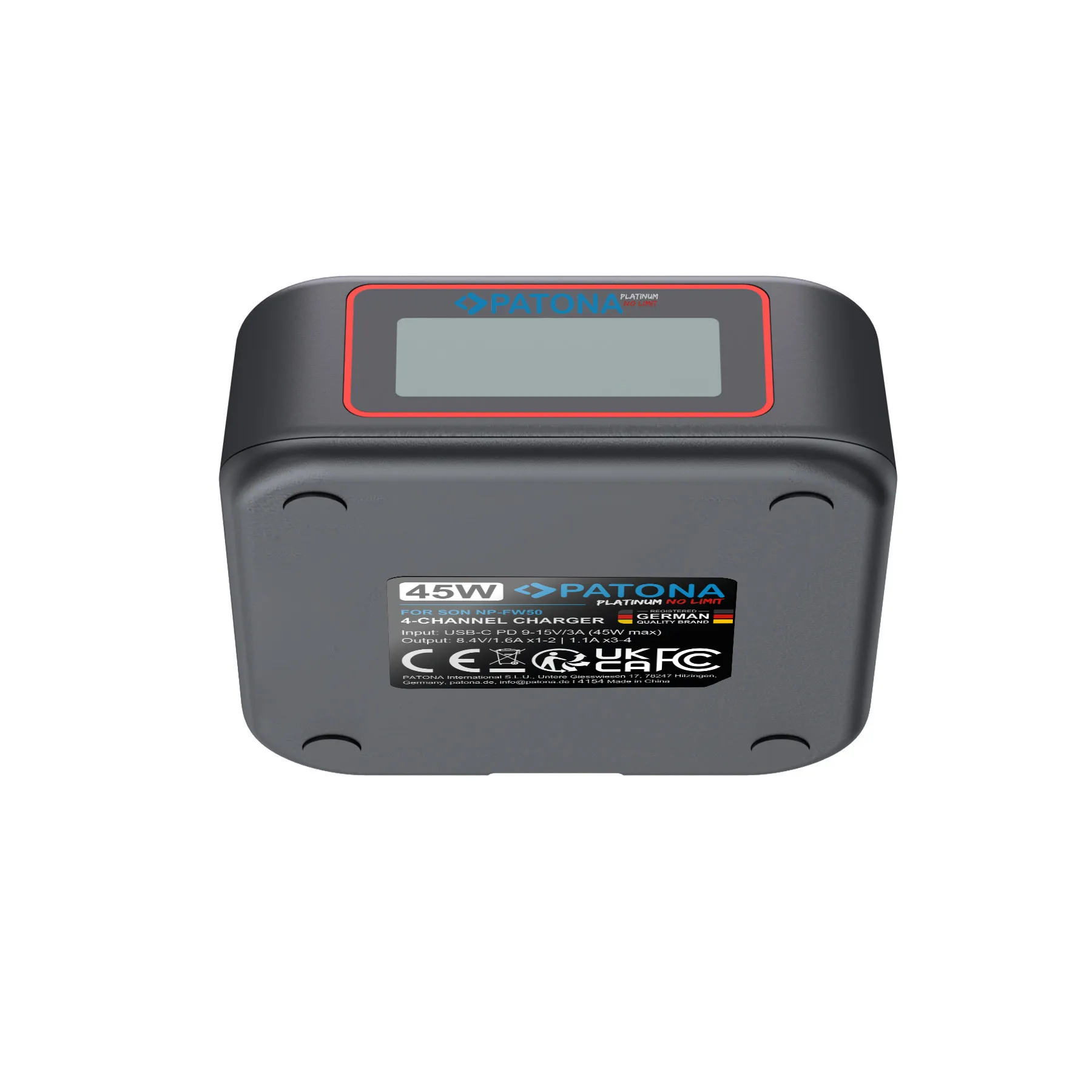 Con il caricabatterie a 4 canali PATONA Platinum, avrai la soluzione di ricarica perfetta per le batterie Sony NP-FW50. Ti consente di ricaricare fino a quattro batterie contemporaneamente e supporta i moderni protocolli di ricarica rapida USB-C (PD e QC). Grazie a una potenza massima in ingresso di 45 W, il caricabatterie regola in modo intelligente l’uscita per garantire una ricarica particolarmente rapida e sicura, sia che si ricarichi una sola batteria o tutte e quattro contemporaneamente.