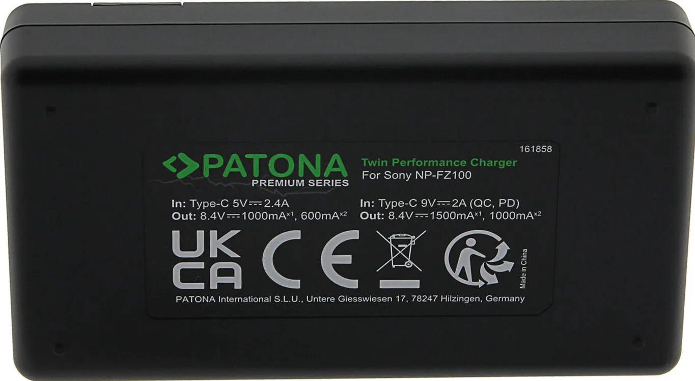 Il caricabatterie è collegato alla fonte di alimentazione tramite la porta USB-C. Si consiglia l’adattatore PATONA Premium PD 20W (vedere la scheda in basso “Accessori”). Si noti che la velocità di ricarica completa si ottiene solo con un caricatore PD da 20W.